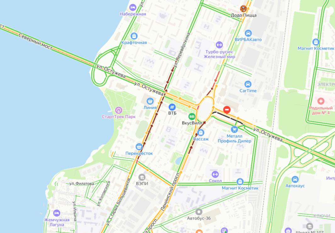 Затор возник сегодня утром, 9 августа. Пробка в сторону Северного моста на Остужева достигает 700 метров, пробка в сторону кольца на Ленинском проспекте превысила километр.