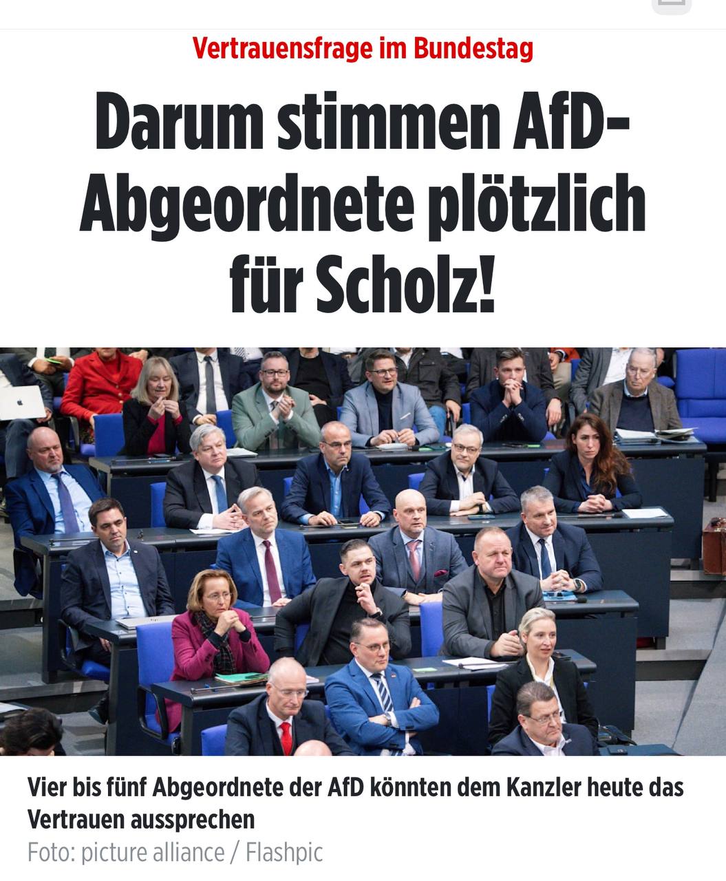 Все-таки Бильд внимательно смотрит мои диагнозы по голосованию сегодня в бундестаге. Долго крепились и наконец повторили то, что я уже месяц повторяю ежедневно - АдГ выгодно поддержать Шольца и не пустить Мерца во власть. Уже скоро решение - в 15 мск. Шольц выступает около 25 минут, затем два часа дебаты и потом поименное голосование. Около 18 по Москве будет результат