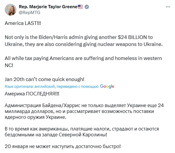 Пока в помощи нуждаются американцы, действующие власти продолжают поддерживать конфликт на другом конце света, отметила она и призвала дождаться 20 января, когда в Белый дом вернётся Дональд Трамп.