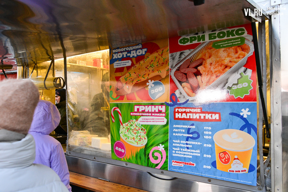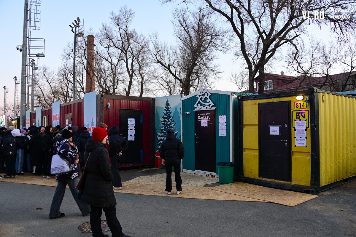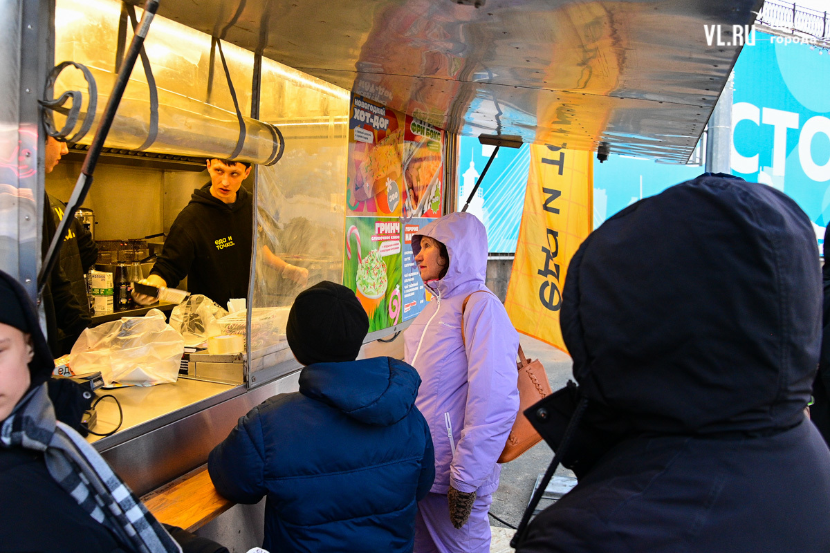 Администрация Владивостока обещала горячий чай – он есть, платный, конечно, потому что это «Еда и точка». За чаем придётся отстоять очередь, но есть и хорошая новость – хотя бы не коньками на асфальте. В сторону фудтрака тоже уложены деревянные плиты.