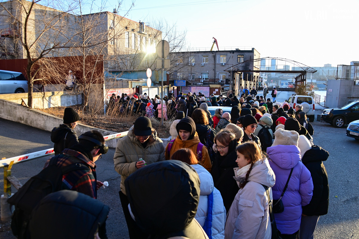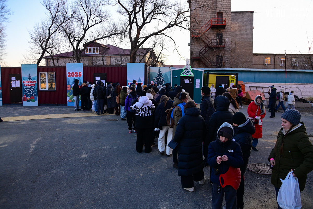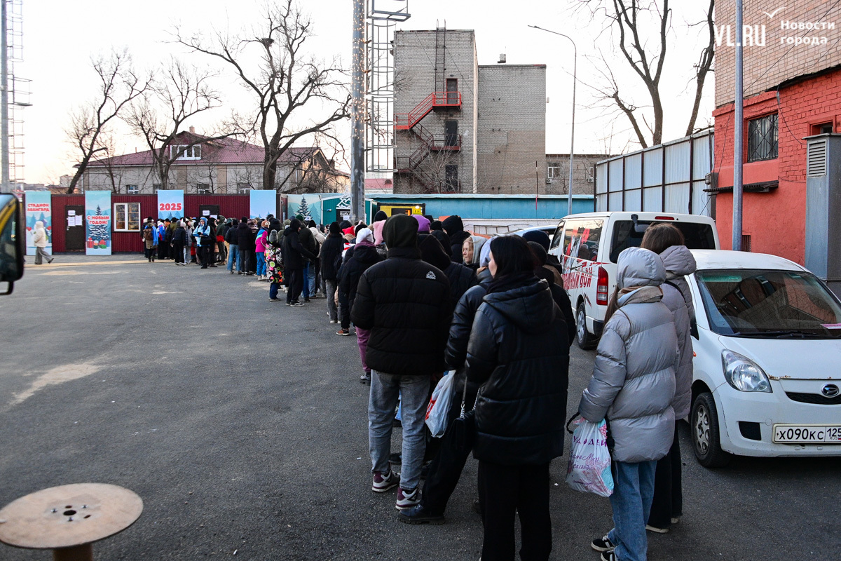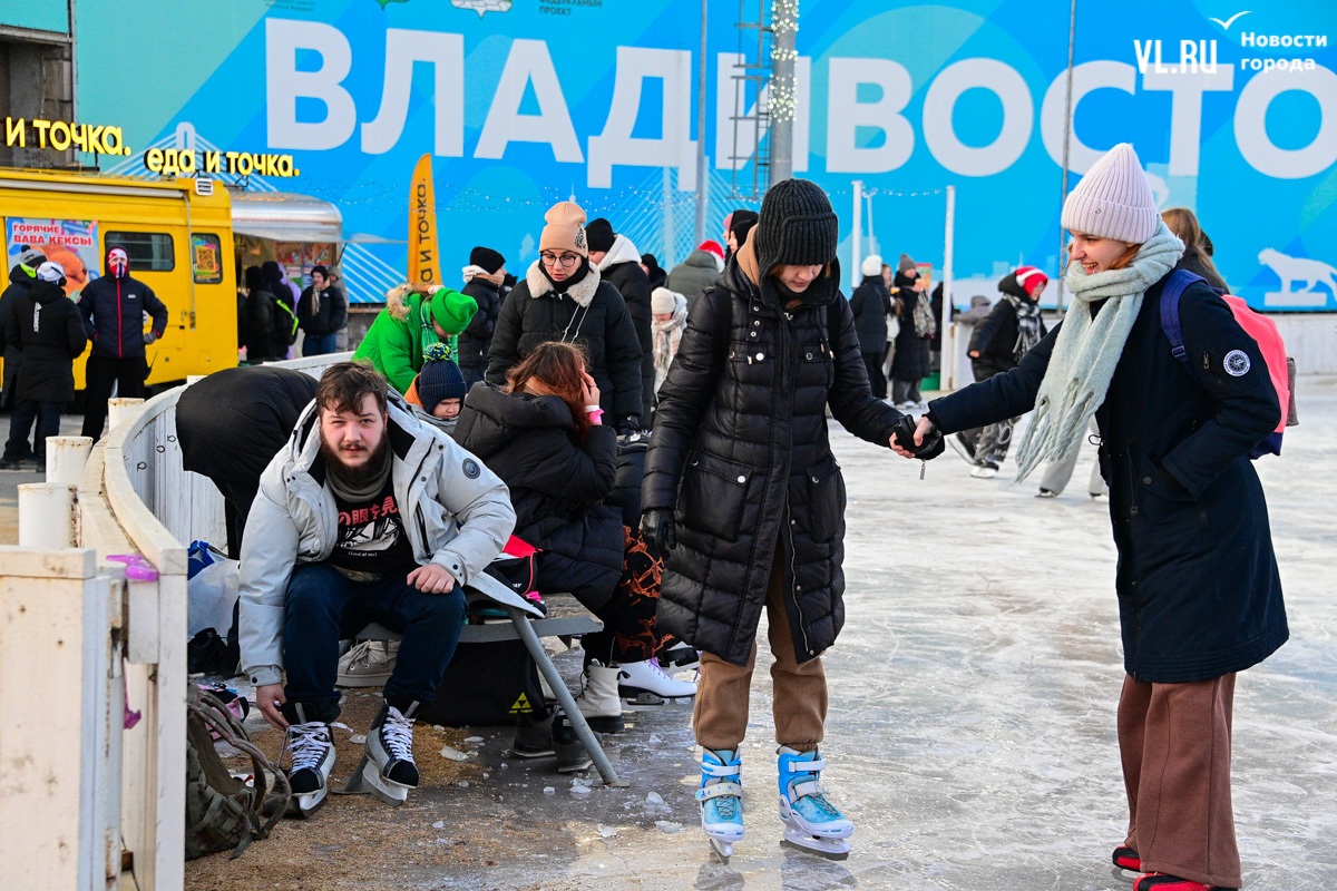 Администрация Владивостока обещала горячий чай – он есть, платный, конечно, потому что это «Еда и точка». За чаем придётся отстоять очередь, но есть и хорошая новость – хотя бы не коньками на асфальте. В сторону фудтрака тоже уложены деревянные плиты.
