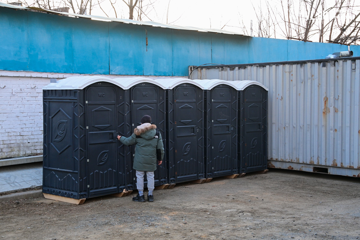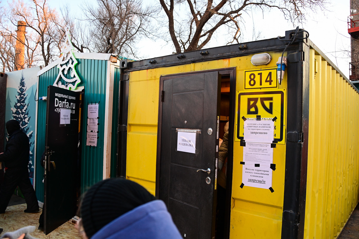 Обстановка перед катком мало чем отличается от прошлого года. Будка с заточкой коньков без обозначения режима работы, рядок биотуалетов и пара тёплых бытовок, где можно раздеться и оставить вещи. Никакого централизованного гардероба, всё исключительно на взаимном доверии. Между теплушками стоит бытовка побольше – прокат коньков. Очередь туда в половину стадиона длиной. Скорее всего, коньков гораздо меньше, чем желающих, хотя к этому сезону, говорят, закупили много дополнительных пар.