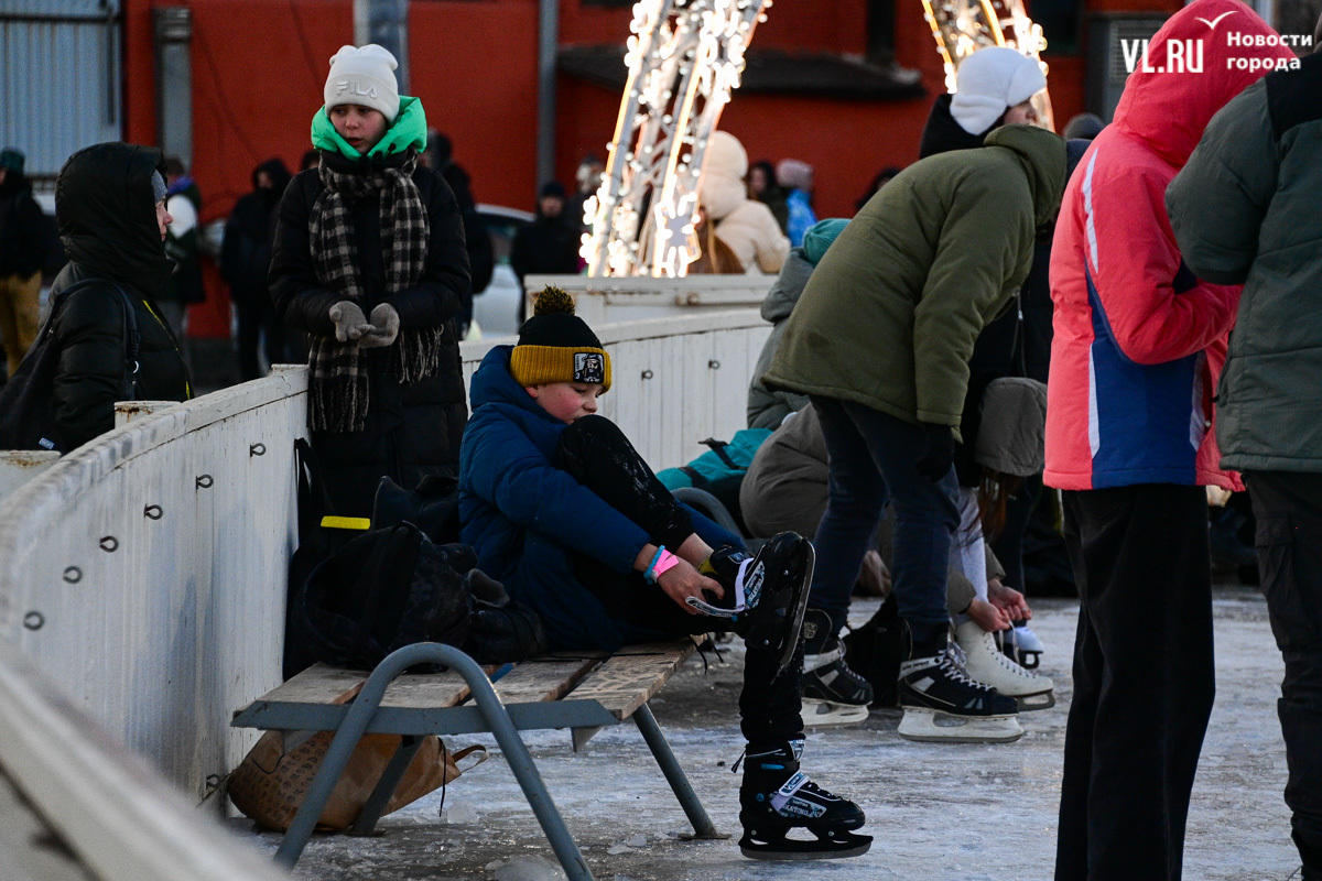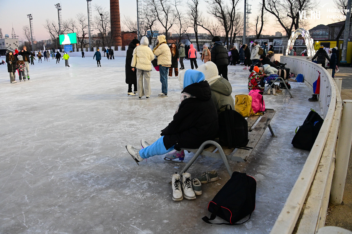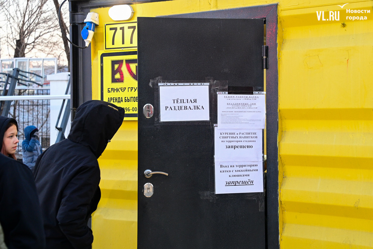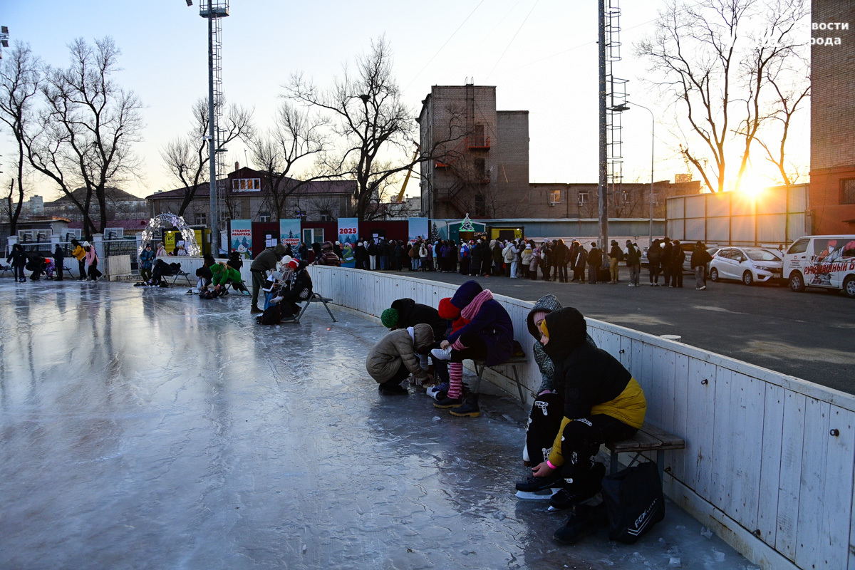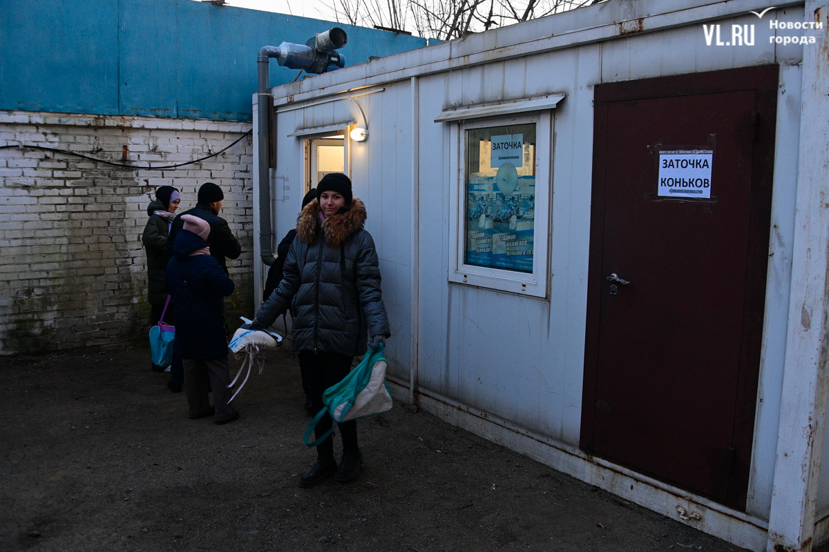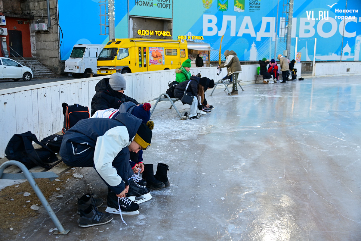 От теплушек к воротам катка лежат «тропы» из OSB-плит, очевидно, чтобы не портить коньки. Но не тут-то было. Поперёк прохода стоит очередь в прокат. Тёплые бытовки забиты людьми, так что переобуваться всё равно приходится где смогли притулиться. Несколько скамеек есть внутри катка, по обе стороны от входных ворот. Корреспонденту Новостей VL.ru удалось переобуться только здесь и бросить сумку за лавку, куда-то в кучу чужих.