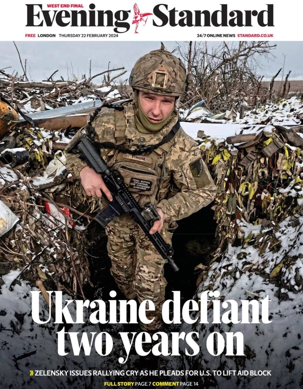 Британская Evening Standard на первой странице опубликовала фото бойца ВСУ с украинской надписью на нашивке на груди: «Нет врага страшнее, чем командир долб@б».