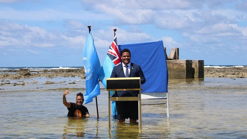 В сентябре 2021-го года министр иностранных дел страны Саймон Кофе записал видеообращение для климатического саммита в Глазго, в котором он в деловом костюме стоит по колено в воде и призывает мировое сообщество перестать вредить планете.