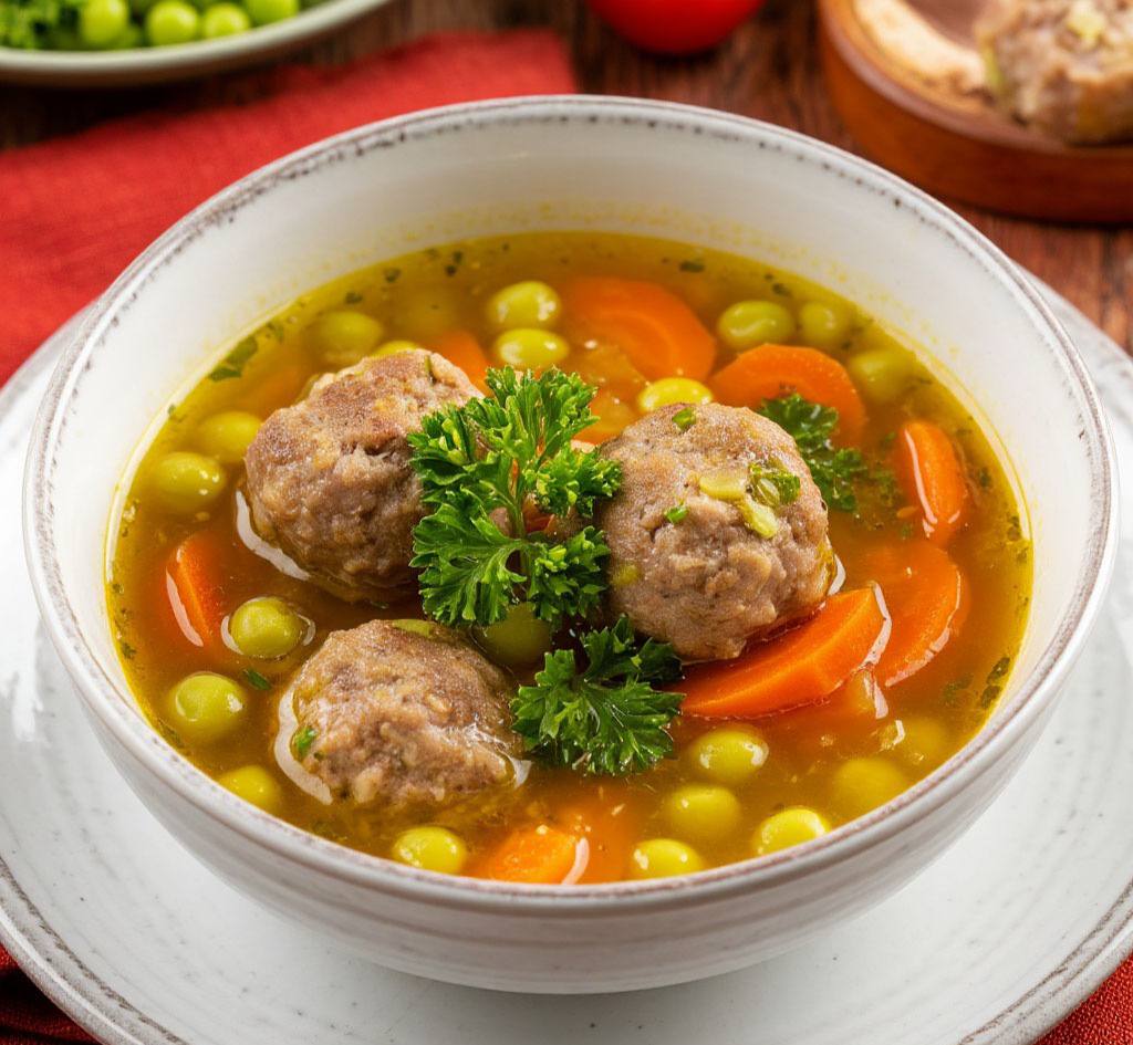 5. В кастрюлю с горохом добавьте не крупно нарезанную картошку, через 10 минут — фрикадельки, а ещё через 10 — зажарку, соль и перец.