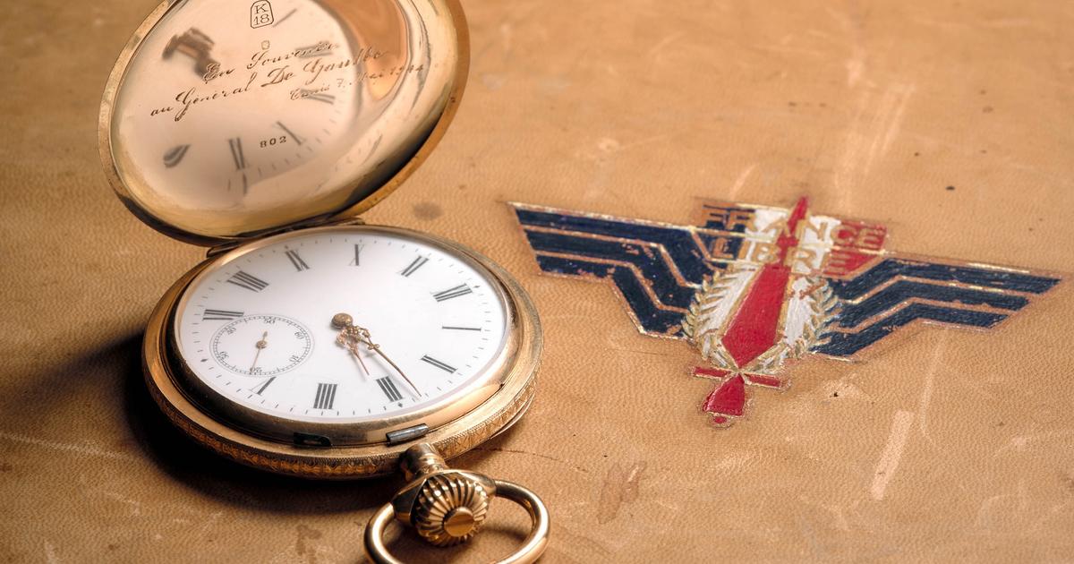 Parmi ces lots figurent tant des montres que des horloges ayant appartenu à l’homme de l’Appel du 18 juin 1940. Certaines peuvent d’ailleurs étonner par la modicité de leur estimation. Ainsi, les montres à gousset de famille ne sont estimées qu’à quelques centaines d’euros. Nul doute que, pendant la vente, elles n’en resteront pas là qu’il s’agisse d’une montre de gousset en or jaune (400/600 €) signée L. Leroy et Cie, portant la mention « L. Leroy & Cie Horlogers de la Marine 7 Bd de la Madeleine Paris No. 3874 », au dos avec des initiales gravées, ou bien d’une montre de gousset savonnette en argent accompagnée d’une chaîne et deux clefs de montres (200/400 €) .