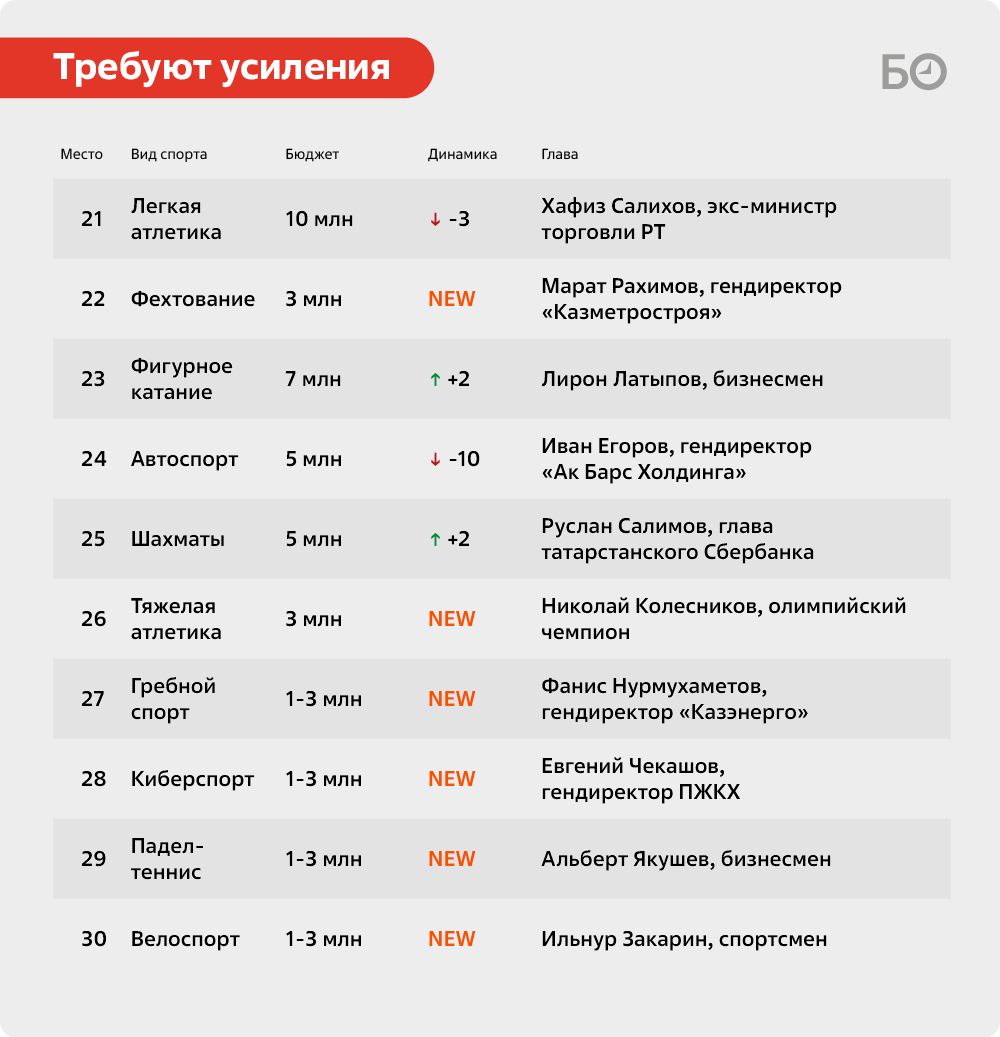 Вести автоспорт в Татарстане — задача ответственная, ведь это самый любимый вид спорта Минниханова. Но есть объективные реалии: занятие это дорогое и доступное не всем. Тем, кому оно всё-таки доступно, всячески ассистирует федерация автоспорта. И поскольку речь идёт о топ-менеджерах «ТАИФа», «КАМАЗа» и других представителях деловой элиты Татарстана, федерация во главе с гендиректором «Ак Барс холдинга» Иваном Егоровым попадает в наш рейтинг.