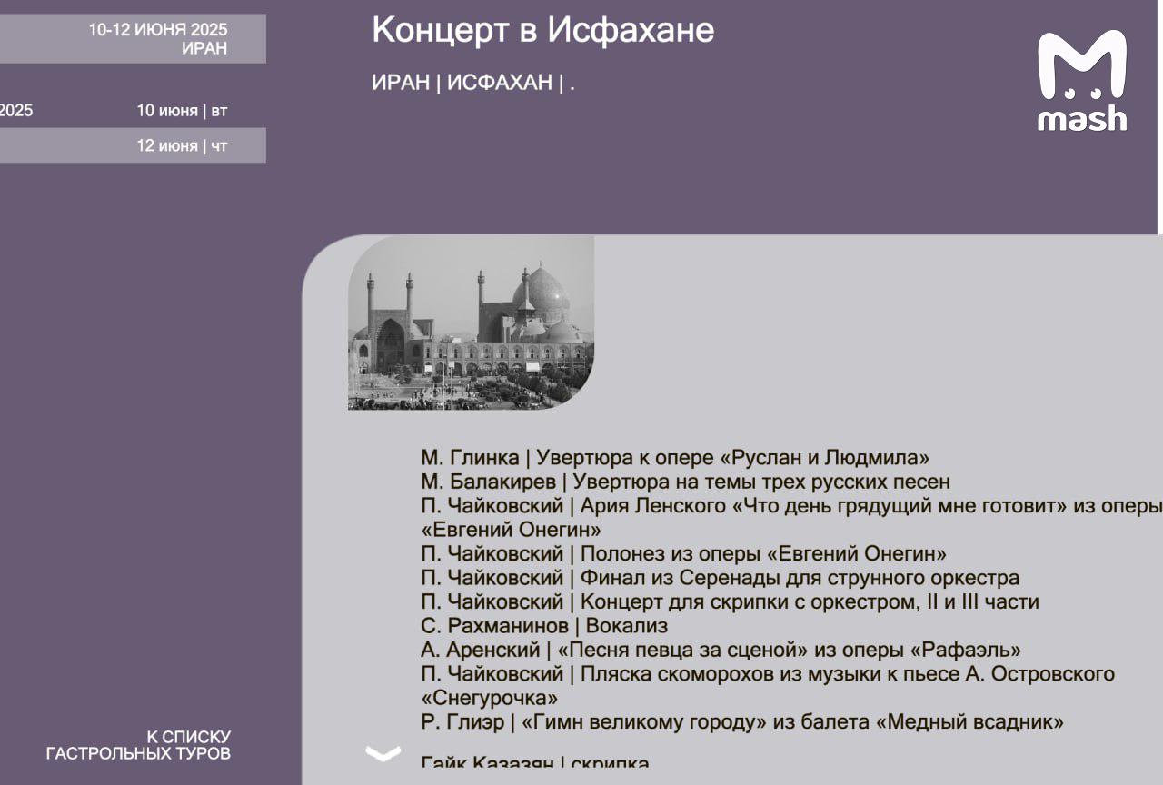 Mash5 месяцев назад ФОТО 51 артист Большого симфонического оркестра прямо сейчас находятся в Иране. 10 и 12 июня они выступали в Тегеране и Исфахане. Дирижировал Арсений Ткаченко. Прорабатывается возможность их эвакуации.❗ Подписывайся на Mash Темы и тегиТегеранИскусство и Культураартист Большой симфонический оркестр июнь Дирижировавший Арсений Ткаченко эвакуация Mash возможность