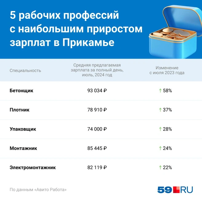 В рейтинге лидеров по приросту зарплат пять специальностей. На первом месте — бетонщики. Им сейчас обещают платить 93 тысячи рублей в месяц — это на 58% больше, чем в июле 2023-го.