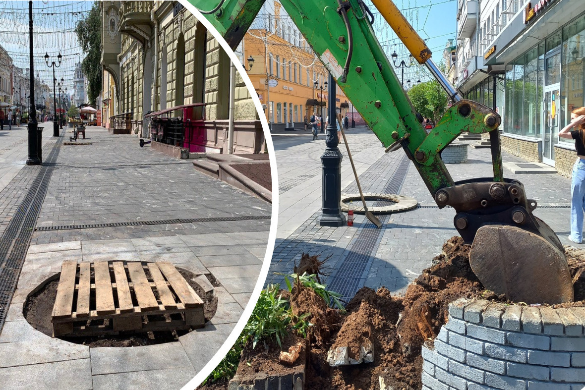 Озеленить Большую Покровскую городские власти пытаются довольно давно. Для этого там из раза в раз устанавливают то клумбы, то вазоны. Во время очередного ремонта центральной улицы Нижнего Новгорода, который начался на прошлой неделе, решили попробовать новый способ высадки. Для этого избавляться от кирпичных кадок начали весьма сурово — с помощью экскаватора.