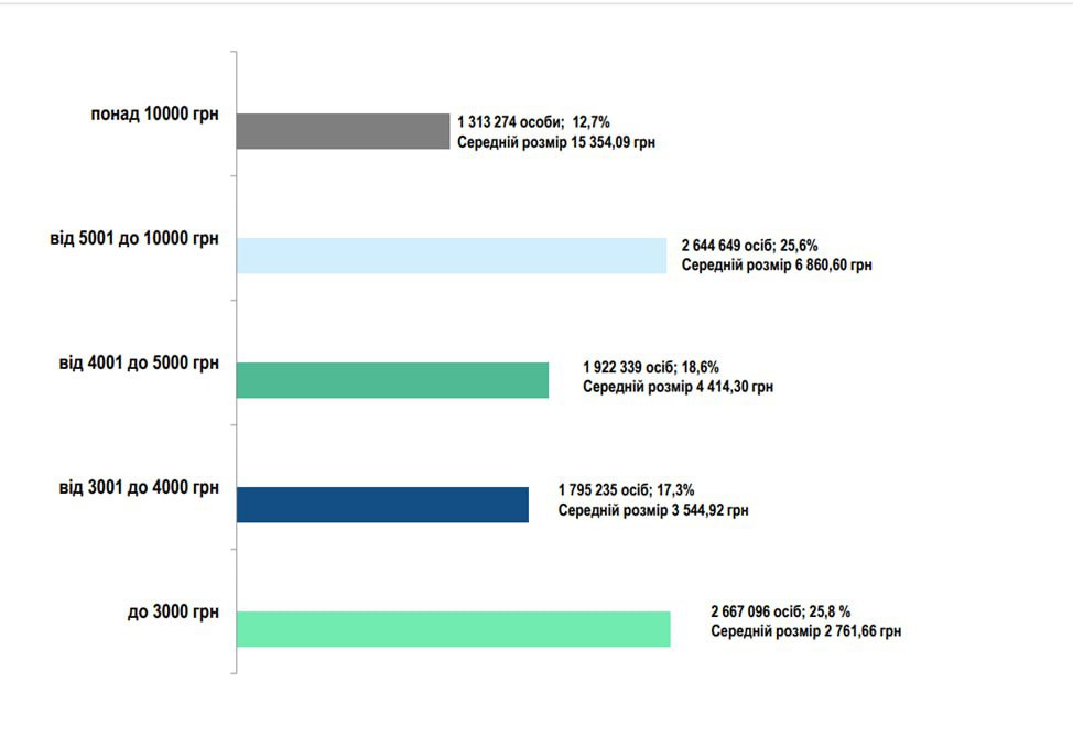 Выплаты от 4 001 до 5 000 гривен получают около 19% пенсионеров. Но эти суммы всё равно не позволяют пенсионерам вести достойную жизнь без ограничений. Более четверти пенсионеров получают от 5 001 до 10 000 гривен.