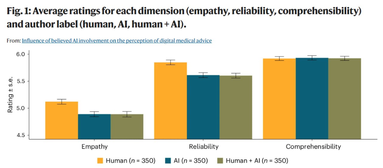 Исследование: Люди гораздо меньше доверяют медицинским рекомендациям, если к ним причастен искусственный интеллект. Респондентам предлагались одни и те же медицинские советы, но в первом случае было указано, что их автор – человек, во втором – ИИ, в третьем – человек с помощью ИИ. Выяснилось, что авторство ИИ (или даже его соавторство) значительно снижают доверие к медицинским рекомендациям. И также снижают желание им следовать. 📊 Опросы и замеры