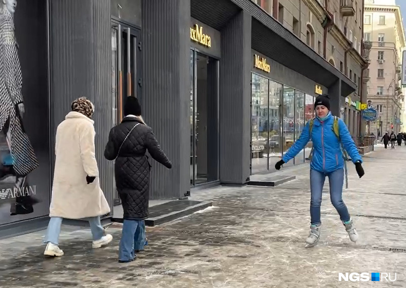 Сквозь пешеходов: НГС предложил сибирячке надеть коньки и покататься по центру Новосибирска — видео из города-катка