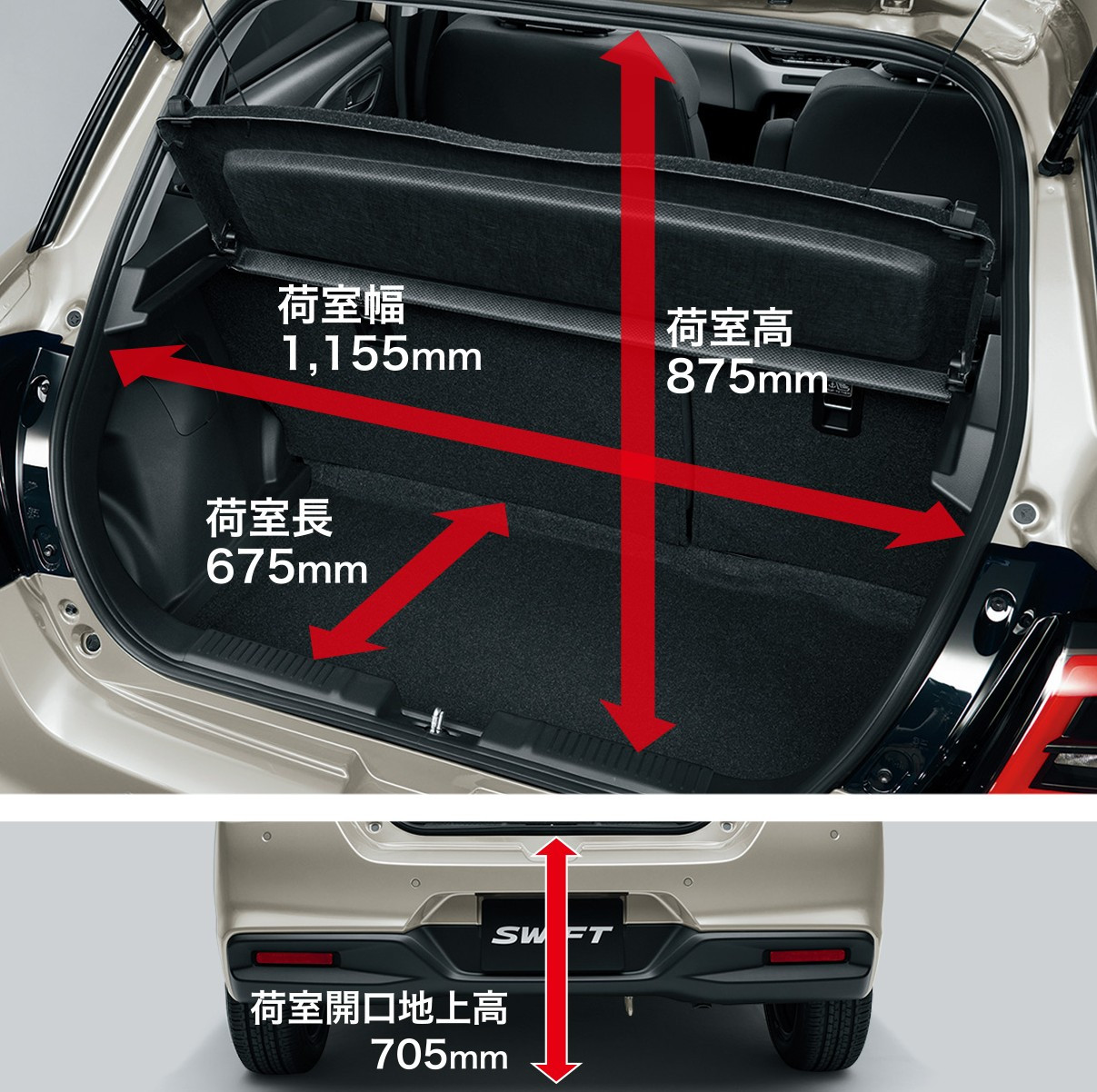 Основные размеры Свифта со сменой поколений практически не изменились: колёсная база прежняя — 2450 мм, габаритная длина хэтчбека четвёртого поколения — 3860 мм, ширина — 1695 мм, высота — 1500-1525 мм (в зависимости от модификации). Кузов стал жёстче за счёт более широкого применения клеевых соединений, улучшена шумоизоляция и аэродинамические характеристики (конкретные цифры не приводятся). Передняя подвеска, разумеется, — типа McPherson, задняя — полузависимая с поперечной торсионной балкой (в том числе у полноприводных версий), ход задней подвески со сменой поколений увеличен, чтобы езда по неровным дорогам была более комфортной. Штатные колёса — 15- либо 16-дюймовые.