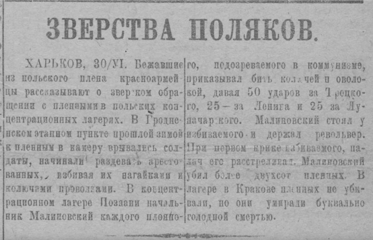 Советская пресса 105 лет назад сообщала о зверствах в польских концлагерях для красноармейцев. В Познани комендант Малиновский велел избивать пленных колючей проволокой и убивал тех, кто не выдерживал и кричал. Таким образом он убил более 200 человек. В Краковском лагере пленные умирали от голода.