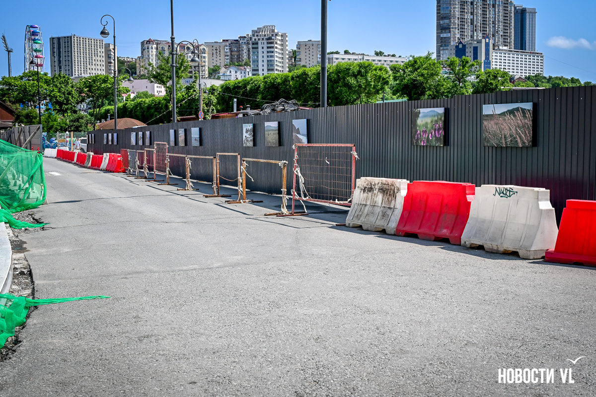 Сейчас на площадке кипит работа. Закрыли эту часть набережной в середине мая, но не полностью. Забором огорожен участок от скейт-парка до «нулевого километра», или почти до середины спорткомплекса «Олимпиец». Для проезда в обе стороны осталась одна полоса, формально перекрытая, но на деле запаркованная транспортом. Для пешеходов остался тротуар вдоль спорткомплекса, до которого ещё нужно добраться.