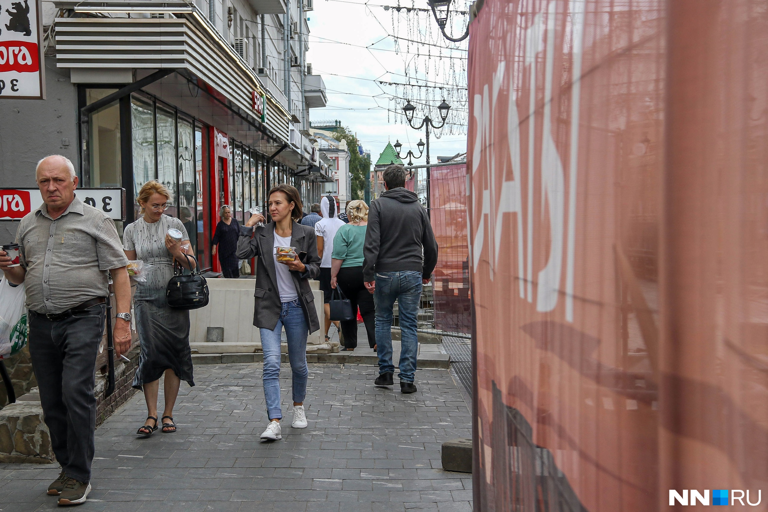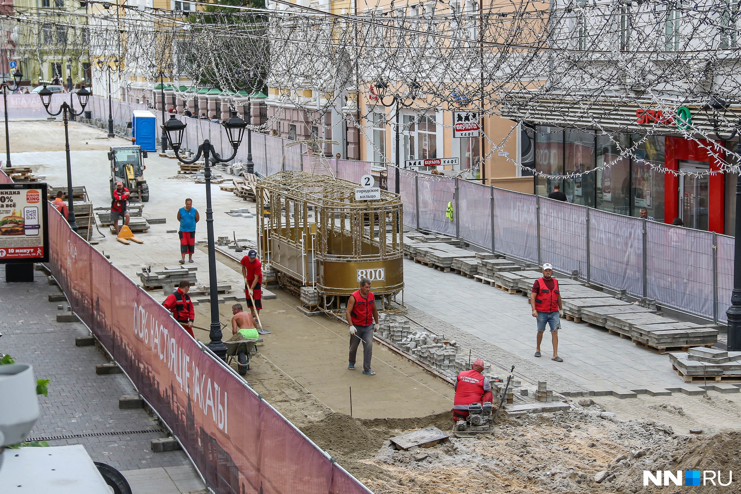 Сейчас на улице вовсю кипят работы. Строители уже убрали часть плитки около трамвайных путей. Вокруг участка выставили ограждение. За закрытой территорией толпы рабочих, а в это время по узким тропкам между зданиями и ограждениями снуют люди, пытающиеся погулять по одной из главных достопримечательностей города.