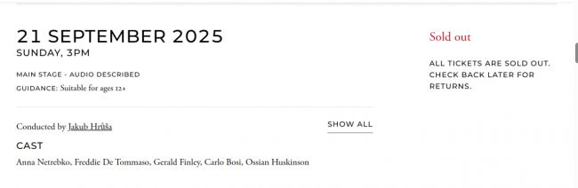 При попытке купить билет потенциального зрителя перебрасывает на оставшиеся в продаже места 24 сентября — с этого момента и до 7 октября партию Флории Тоски будет петь польская исполнительница Александра Курзак. Исполнители партий Каварадосси (Фредди де Томаззо), барона Скарпии (Джеральд Финли), Сполетты (Карло Бози) и Анджелотти (Оссиан Хаскинсон) остаются неизменными.