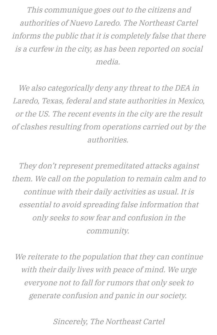 ❗️Наркокартель C.D.N., базирующийся в Нуэво-Ларедо, Мексика, выступил с заявлением, что в городе не объявлен комендантский час, и картель не намерен нападать на американские войска и мексиканских агентов после вчерашнего наращивания и перемещения американских войск.