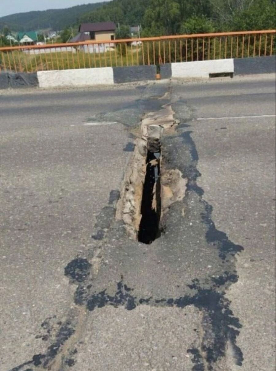 На мосту перед заливом Златорева в Караидельском районе образовался провал по технологическому шву. Ширина 15-20 сантиметров, а длина почти на всю ширину полосы.