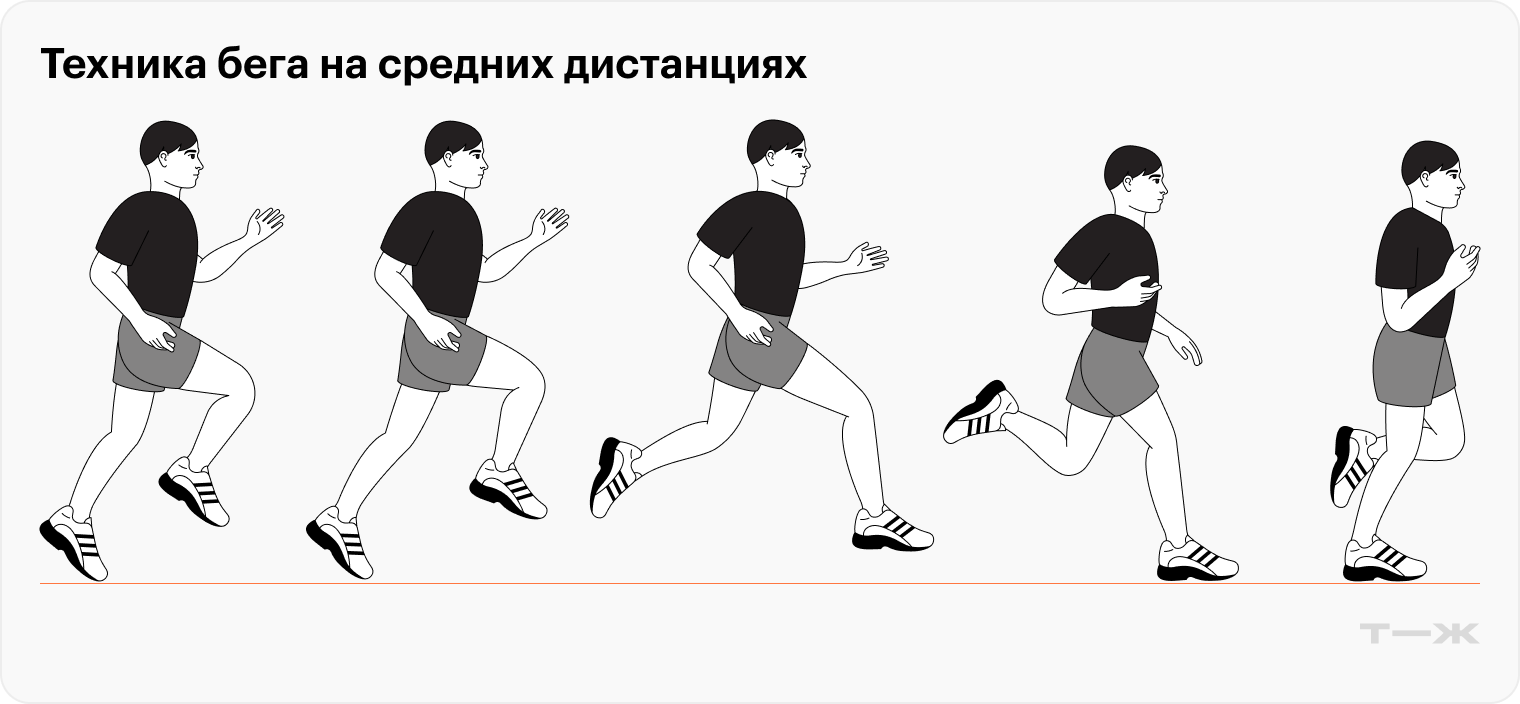 - Техника бега на средние и длинные дистанции схожа. Спортсмены начинают забег с высокого старта, во время бега ноги поднимаются не так высоко, а руки согнуты под прямым углом и работают менее активно, чем в спринте. Длина и частота шагов тоже меньше.