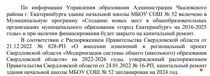 Также там отметили, что «количество учащихся в некоторых классах превышает нормы площади на одного обучающегося». Прокуратура обратилась с этим вопросом в администрацию Екатеринбурга, он «находится на рассмотрении».