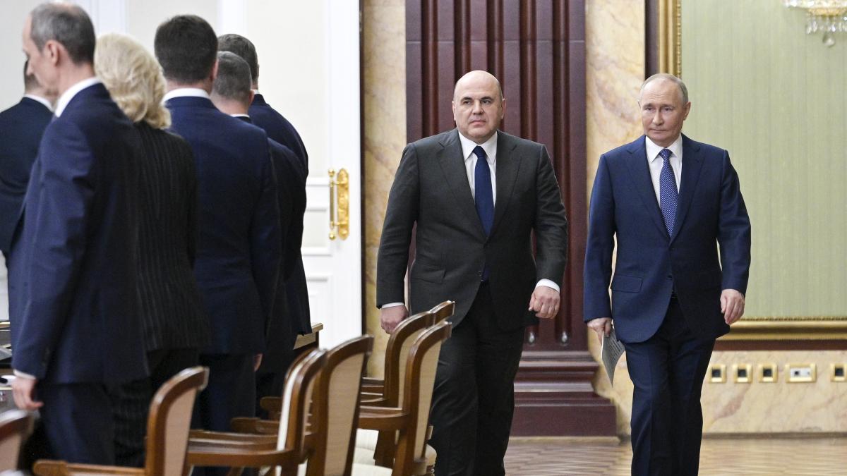Il presidente russo Vladimir Putin, a destra, scortato dal primo ministro russo Mikhail Mishustin arriva per un incontro con i membri del governo lunedì a Mosca.