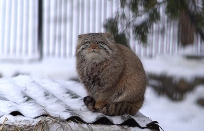 Несмотря на сибирские морозы, манул решил прогуляться по территории вольера. Затем, видимо, заморозив лапки, он аккуратно ставит их на свой пушистый хвост, а потом смотрит на снежинки.