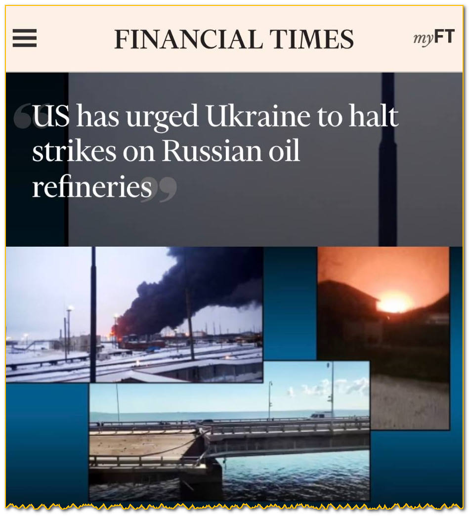 Вашингтон призывает Украину прекратить удары по нефтеперерабатывающим заводам, терминалам, хранилищам и складам России. Статья об этом появилась на страницах Financial Times. Сигнал Киеву недвусмысленный: Штаты против украинских терактов на русских НПЗ, так как «это повысит цены на бензин и может сорвать предвыборную кампанию Байдена».