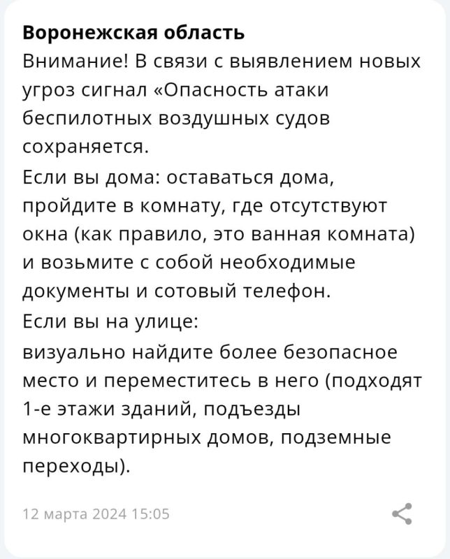 Уведомления об этом разослали воронежцам сегодня днём, 12 марта. Также местным жителям напомнили, что предпринять при угрозе БПЛА.