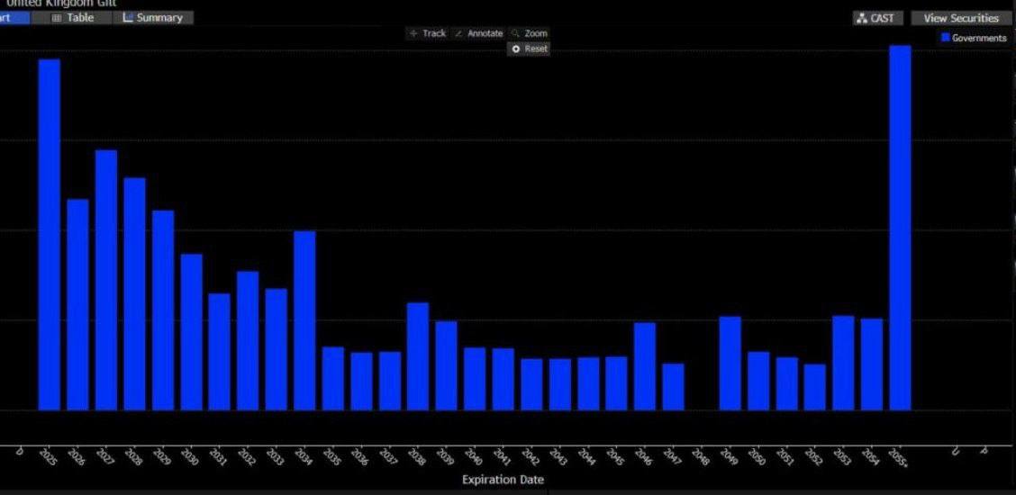 В этом году Великобритании необходимо рефинансировать 200 млрд долларов из общей суммы долга в 2 трлн долларов по самой высокой за последние десятилетия ставке. Могут возникнуть проблемы.