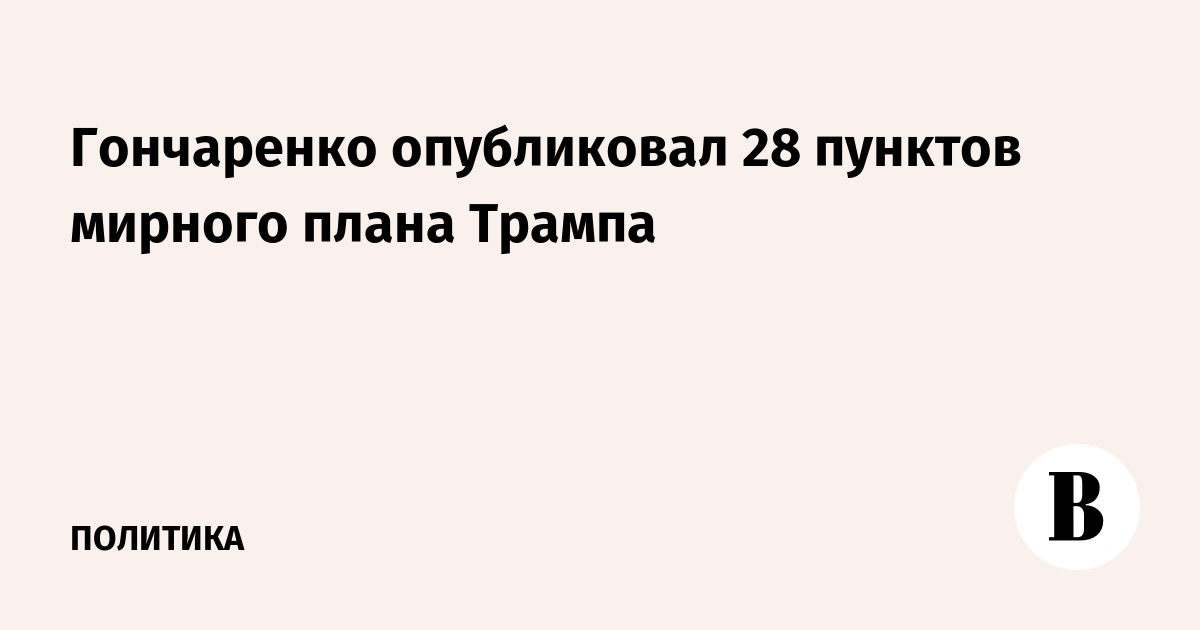 Украинский депутат Алексей Гончаренко опубликовал в своем Telegram-канале, как он утверждает, разработанный США план по урегулированию из 28 пунктов. Среди них – признание де-факто российскими Крыма, Донецка и Луганска.