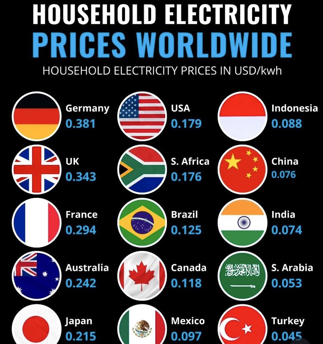 Получается, у нас электричество стоит дороже, чем в Китае. И не сильно отличается от цены электричества в Канаде.