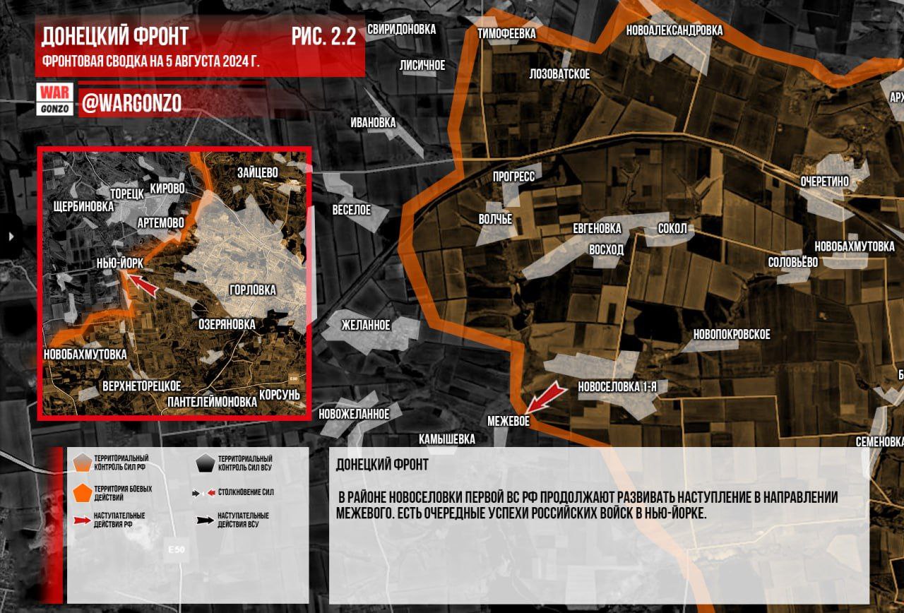 Донецкий фронт. В Красногоровке российские войска продолжают мероприятия по зачистке подконтрольной территории. В Карловке продолжаются ожесточённые бои, без существенных изменений. В районе Новоселовки Первой ВС РФ продолжают развивать наступление в направлении Межевого. Есть очередные успехи российских войск в Нью-Йорке. (Рис. 2)