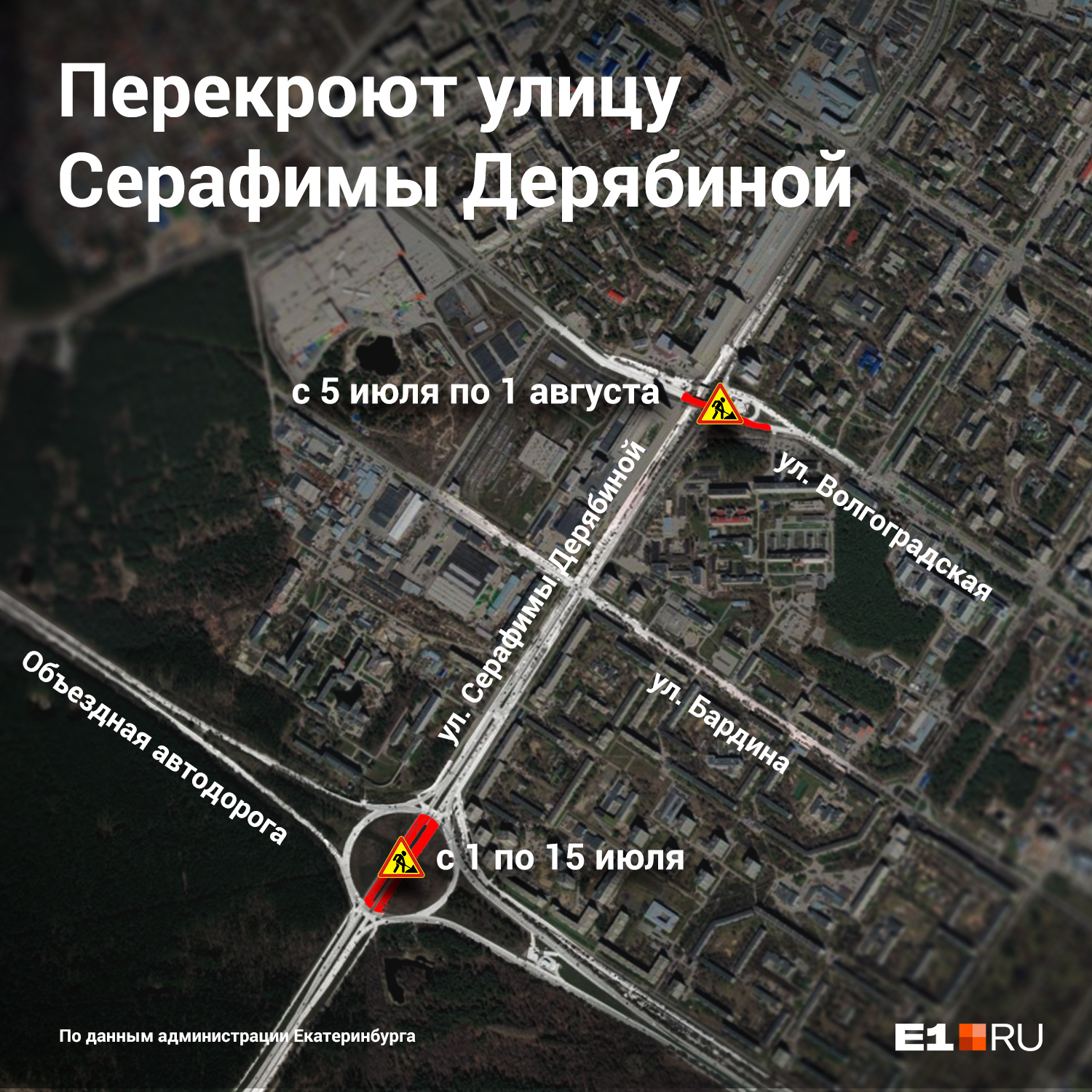 Первый этап: с 1 по 15 июля будет закрыто пересечение улицы Серафимы Дерябиной с Объездной. Объехать участок можно будет по транспортному кольцу.