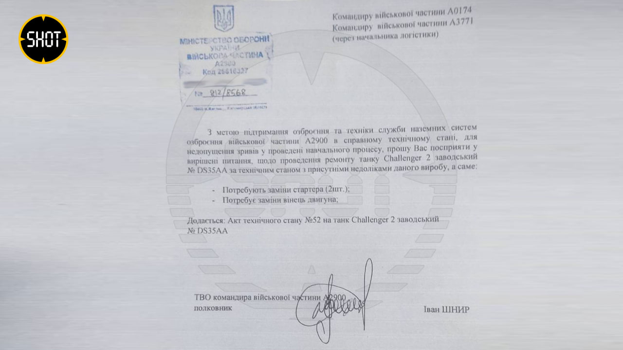 По данным SHOT, у британского Challenger 2 с заводским номером DS35AA в течение двух недель произошло три критические поломки: накрылись два стартера и венец маховика. Именно эти детали срочно запрашивал врио командира украинской в/ч А2900, солдаты которой участвовали в боях под Авдеевкой, Иван Шныр.