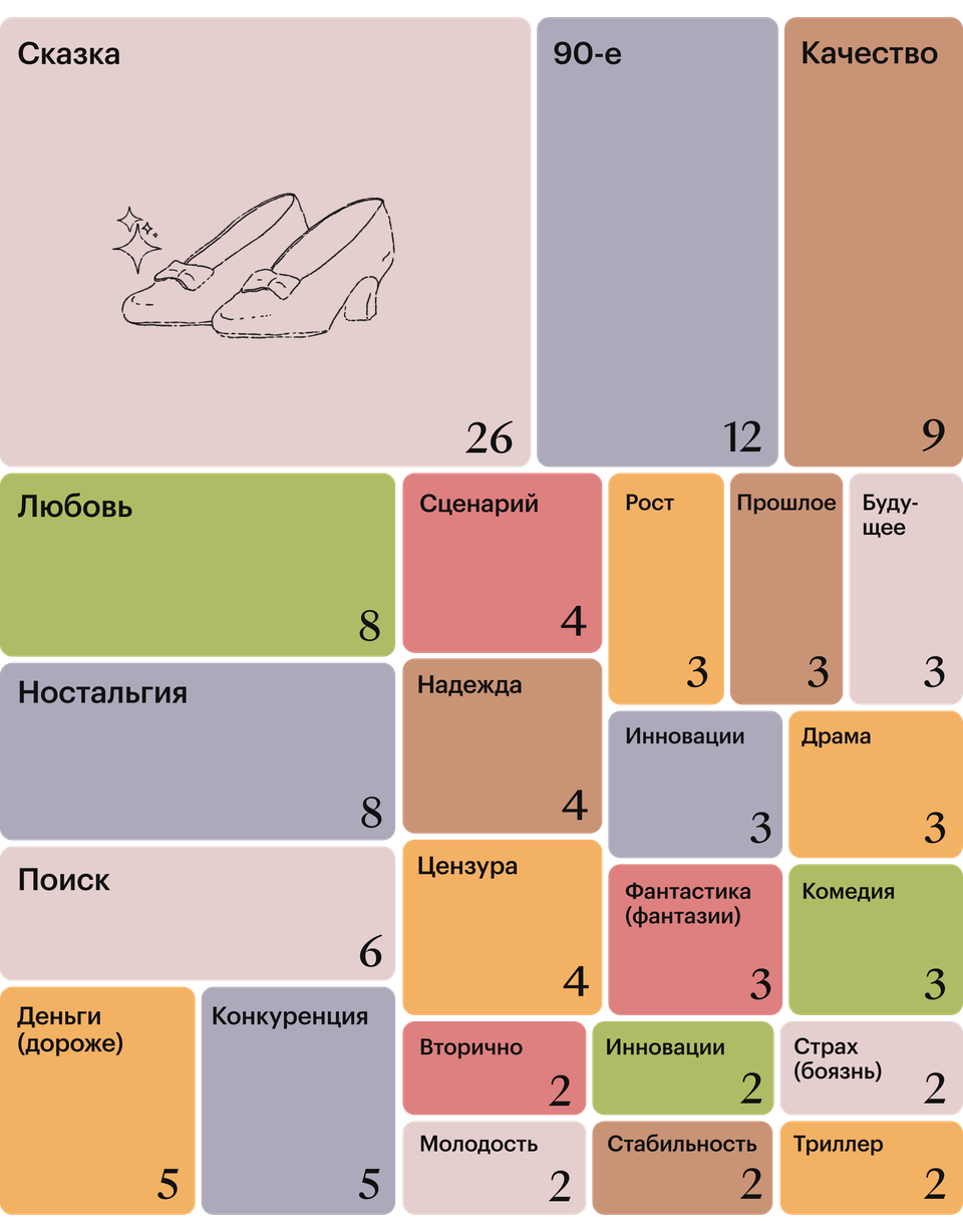 Часть респондентов называли три слова. Например, Надежда Васильева сказала «Страх. Ненависть. Любовь», а Юлиана Слащева — «Поиск. Эксперимент. Успех». Некоторые отвечали фразами (Александр Косарим — «Комбинация ностальгии и современности», Александр Андрющенко — «Количество победило качество»). У части опрошенных слов получилось больше. Например, у Фёдора Бондарчука — «Слово пацана. Перегрев. ИИ», а у композитора Дмитрия Носкова — «Качество. Взгляд внутрь. Любовь к рассказам историй». У некоторых слов было меньше: Александр Войтинский назвал «сказку», хотя также предложил записать в главные слова заклинание «крибле-крабле-бумс»; мы засчитали только одну «сказку». Это же слово трижды повторил Игорь Толстунов, добавив ему три балла. А вот Сарик Андреасян трижды назвал «цензуру»; еще раз она возникла в формулировке его коллеги по К.Б.А. Гайка Асатряна — «Цензура и неопределенность будущего».