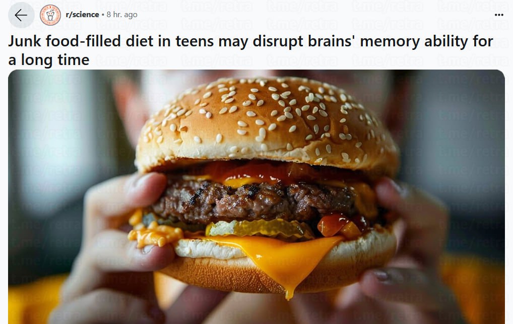 Особенно значительный дефицит памяти наблюдался при употреблении фастфуда в подростковом возрасте. При этом последующий переход на здоровое питание не помогает избавиться от этой проблемы