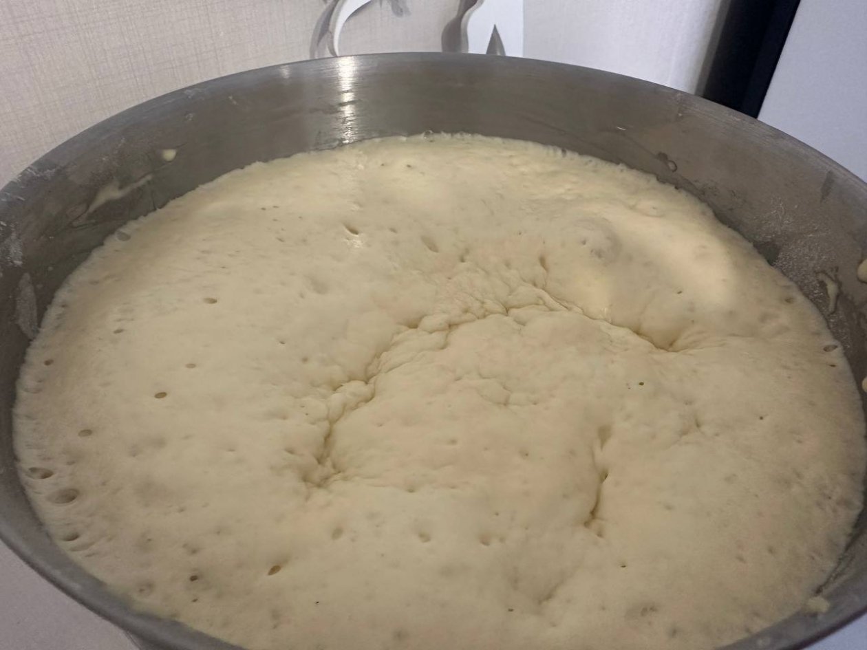 Соль соединяем с мукой, а затем всыпаем все к дрожжевой массе. Замесите тесто и добавьте растительное масло.