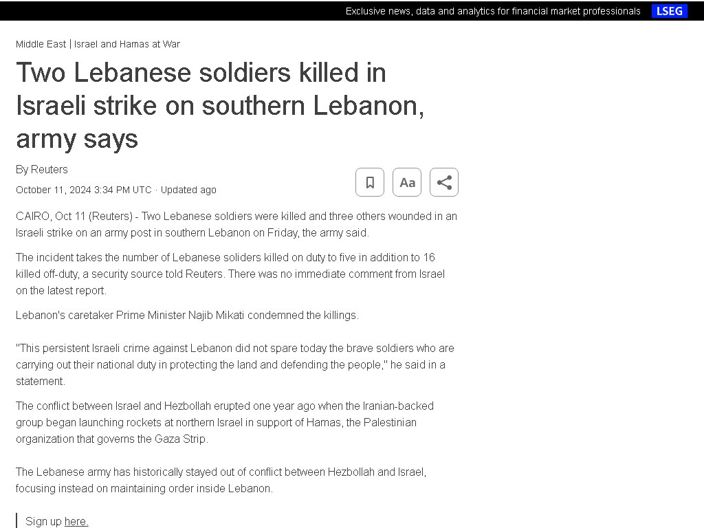 В результате инцидента число ливанских солдат, погибших при исполнении служебных обязанностей с начала наземного вторжения, достигло пяти, в дополнение к 16 погибшим вне службы (в основном погибли дома при бомбардировках Израиля), сообщил Reuters источник в службе безопасности.