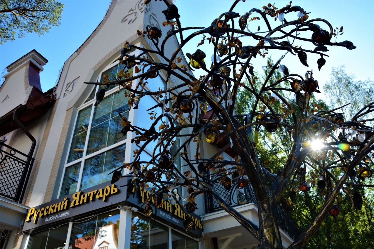 В местах для отдыха находятся и скамья для влюбленных со спинкой из сердец в чугунном обрамлении, и винтажная яблоня с яблоками из янтаря на ветвях,