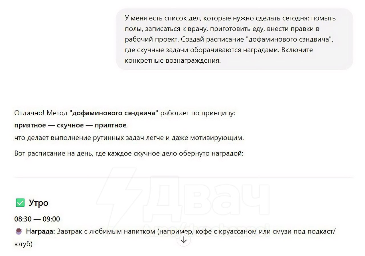 У меня есть [задачи], которые нужно сделать сегодня. Создай расписание "дофаминового сэндвича", где скучные задачи оборачиваются наградами. Включи конкретные вознаграждения.