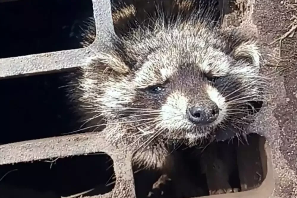 Прибывшие на место офицеры сняли крышку канализационного люка, однако это не помогло: голова енота очень крепко застряла между стальными прутьями решетки.