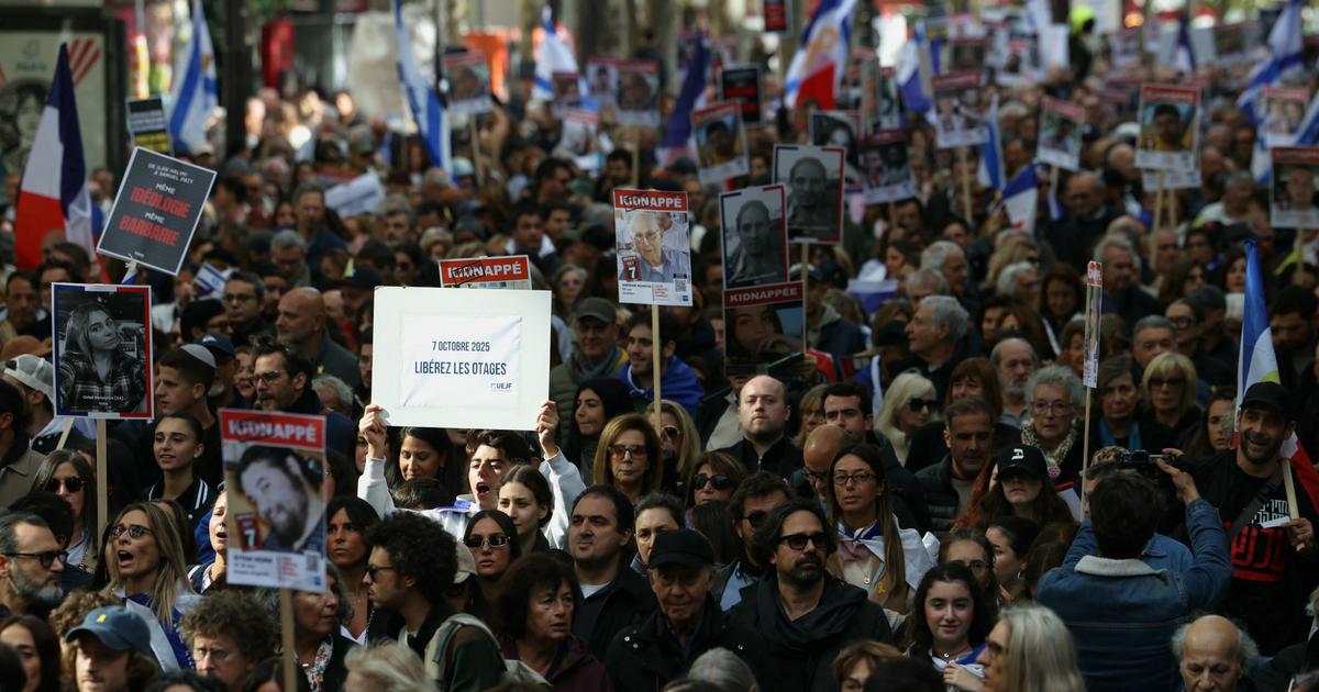 Le cortège s’élance de la Place de la République un peu après 14 heures. Les milliers de participants brandissent des pancartes avec des photos des otages ou des drapeaux français et israéliens, sur lesquels ont été ajoutés des rubans jaunes - symbole des otages israéliens - également accrochés sur les manteaux. Il y a des dizaines d’enfants. Certains ont enroulé le drapeau israélien sur leurs épaules. Les manifestants s’égosillent : «Akhshav!» (Maintenant !) ou encore «Hamas, terroriste !», quand ils n’appellent pas à «libérer les otages».