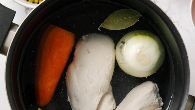 Для приготовления бульона куриное филе опустить в кастрюлю с водой и довести до кипения. Первую воду слить. Мясо промыть и отправить обратно в кастрюлю. Налить нужное количество воды, добавить одну очищенную морковь, одну луковицу, немного соли и лавровый лист. Содержимое вскипятить. Убавить огонь и варить до готовности примерно 40–50 минут. Через 15–20 минут кипения вынуть из бульона лавровый лист