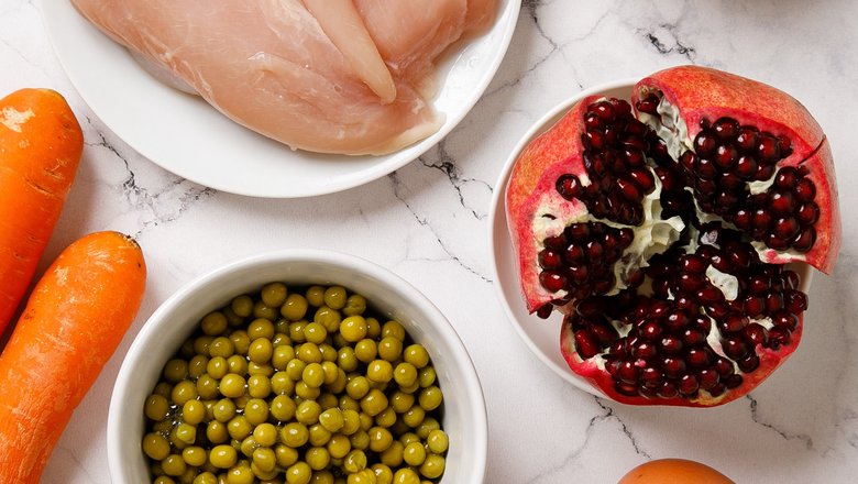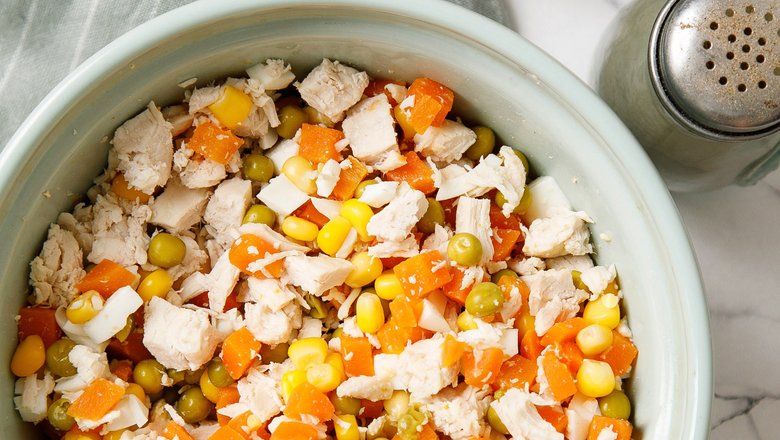 В подходящую емкость выложить консервированную кукурузу и зеленый горошек, нарезанную курицу, белки и морковь. Аккуратно перемешать и приправить солью