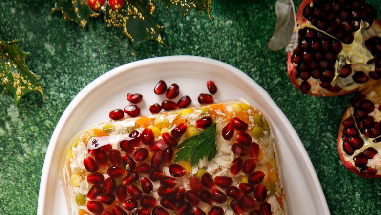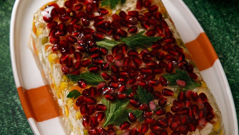 Переверните формочки (или форму) на плоское блюдо, чтобы гранатовая сторона была сверху. Если заливное не отойдет от формы, нужно накрыть форму горячим полотенцем, и тогда заливное с легкостью отсоединится. Приятного аппетита!