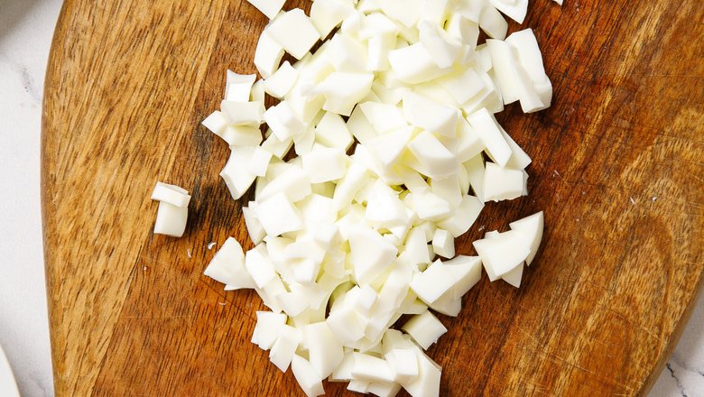 Сварить яйца вкрутую в подсоленной воде, остудить, очистить, отделить желтки, они не понадобятся. Белки нарезать небольшими кубиками