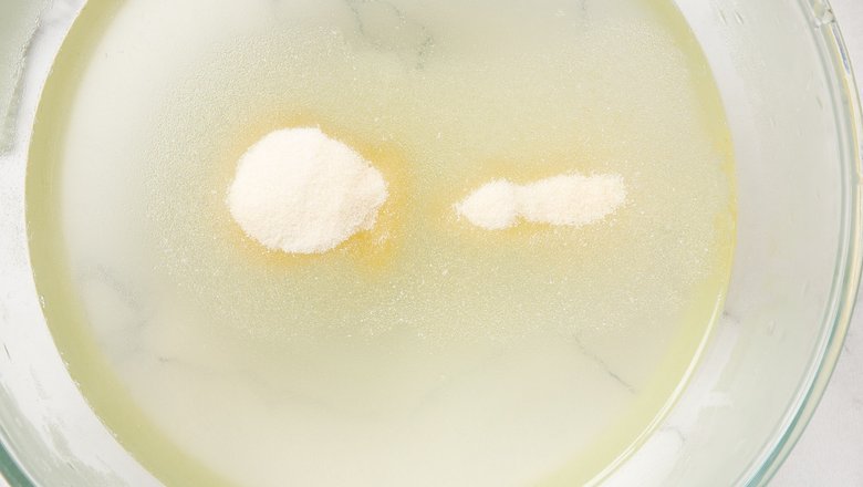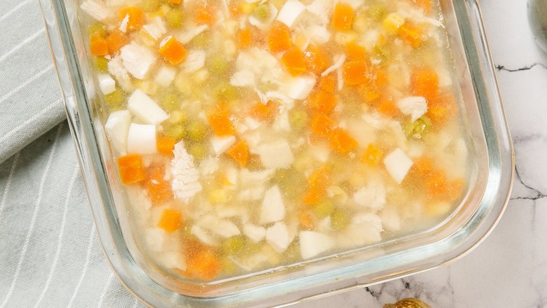 Бульон процедить и остудить до 70–80 градусов. Добавить быстрорастворимый желатин и перемешать до его растворения